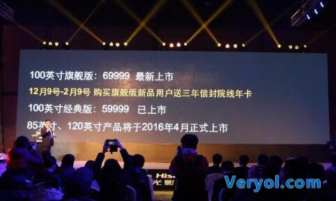 非常在線 2015年12月9日消息,今天下午,在北京市751D?PARK時尚設計廣場,海信如約舉行了“來,看看未來”新品發布會!并發布了海信全新一代激光電視。1 據悉,海信全新一代激光電視將在產品線擴展、亮度、圖像彩色、細節表現方面進一步提升,并將軟、硬件系統進行全面的提升。另外,激光電視的優勢是無屏,輕量化和舒適度提升,和前幾代顯示技術相比有天然的優勢,同時也是實現全息顯示的唯一途徑。 在售價方面,100英寸旗艦版售價69999元,最新上市,且在12月9日—2月9日購買該產品的用戶,可獲得三年信封院線年卡;100英寸機經典版售價59999元,已上市;85英寸和120英寸產品將于2016年4月正式上市。2 在發布會上,海信表示,激光電視和主流的液晶電視相比,在環境適應性,畫質,自然光,功耗,尺寸等方面有著更多的優勢,所以未來電視的名號是實至名歸。同時還表示,2016年將成為激光電視的元年,激光電視將成為未來電視的新標準!在未來5年,激光電視將全面擠壓LED和OLED市場空間。真是這樣嗎?我們拭目以待!